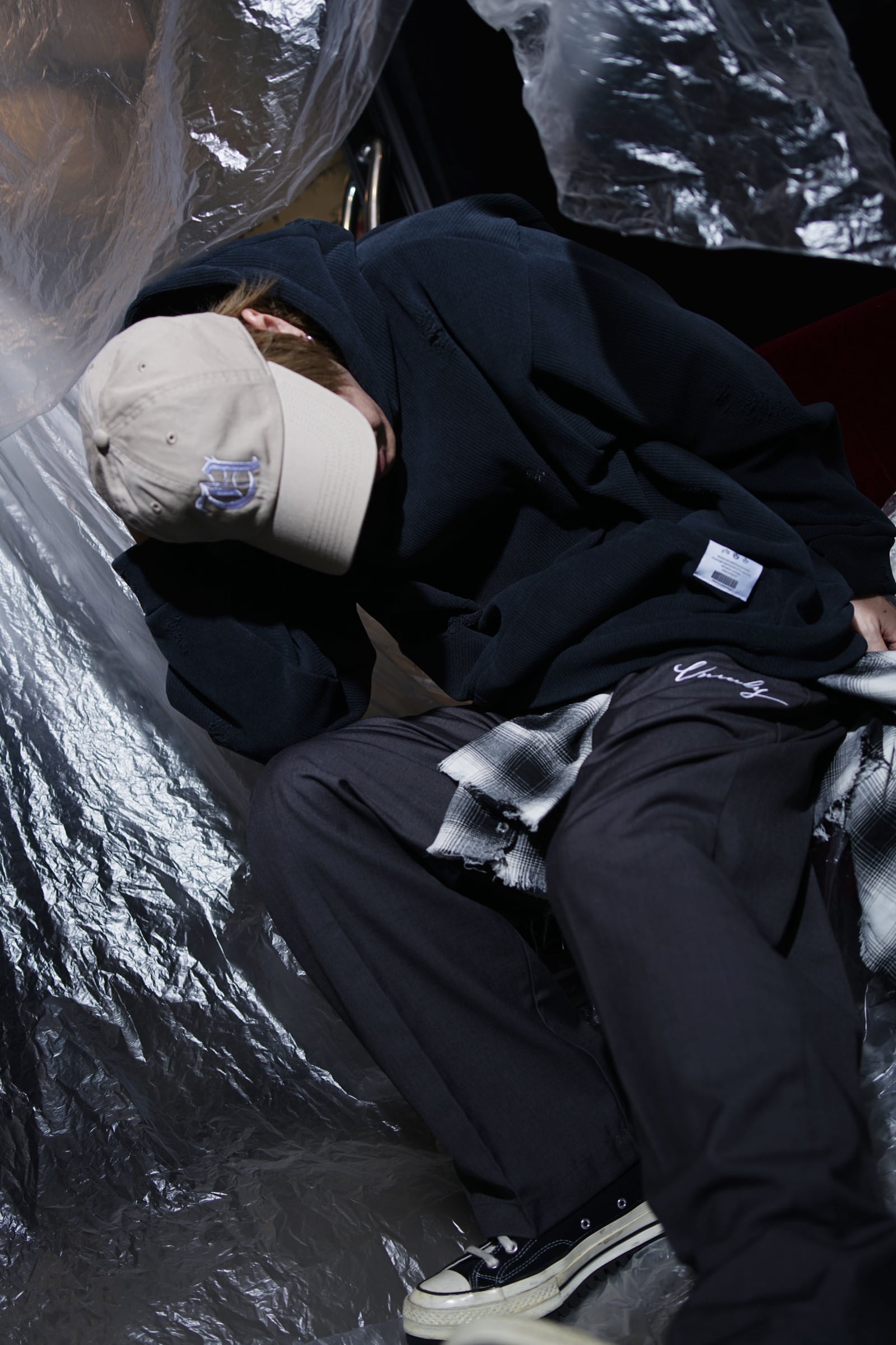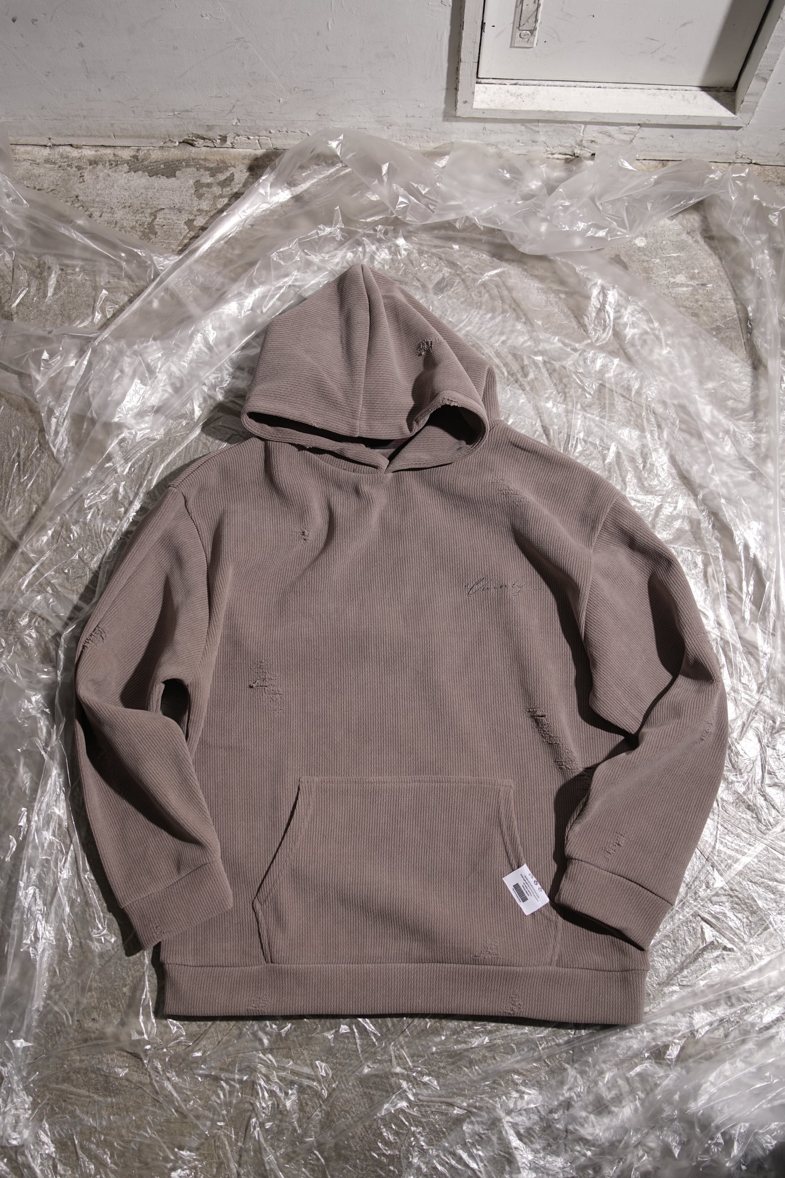 裏ジャガードならではの立体的な陰影に、計算されたダメージ加工を加えたフーディ。深みのある表情とドライな質感が特徴で、単体でもレイヤードでも存在感を放つ無骨さの中に上品さも宿る一着です。ルーズすぎないリラックスシルエットで、ユニセックスに着用可能。