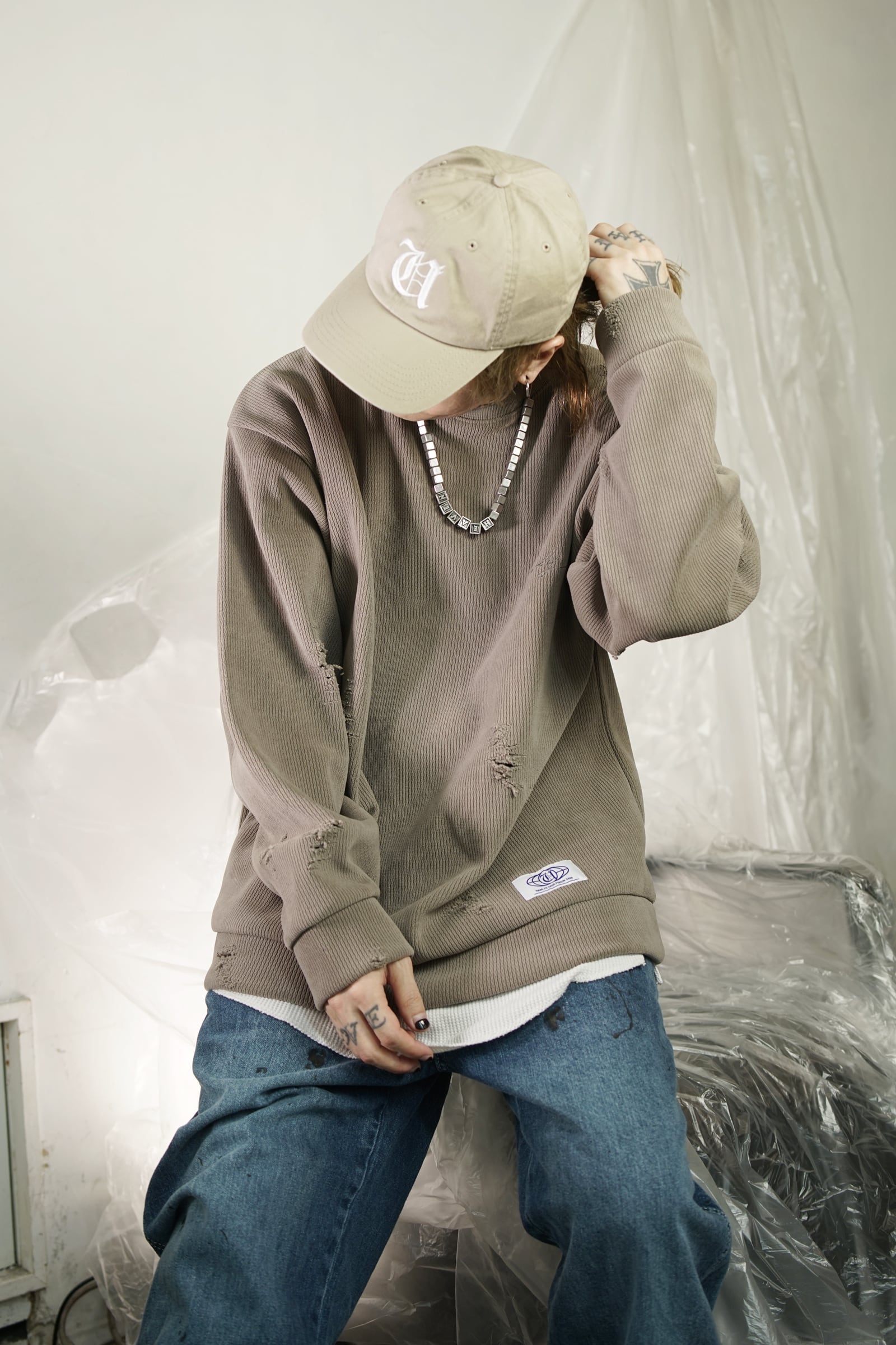 裏ジャガードの奥行きあるテクスチャと、計算されたダメージを組み合わせたスウェット。フーディよりもミニマルな分、素材の陰影と削ぎ落とされた佇まいがより際立ちます。程よくゆとりを持たせたシルエットは、性別を選ばないニュートラルなバランス。静かに存在感を放ち、レイヤードにも単体にも強さを与える一着です。